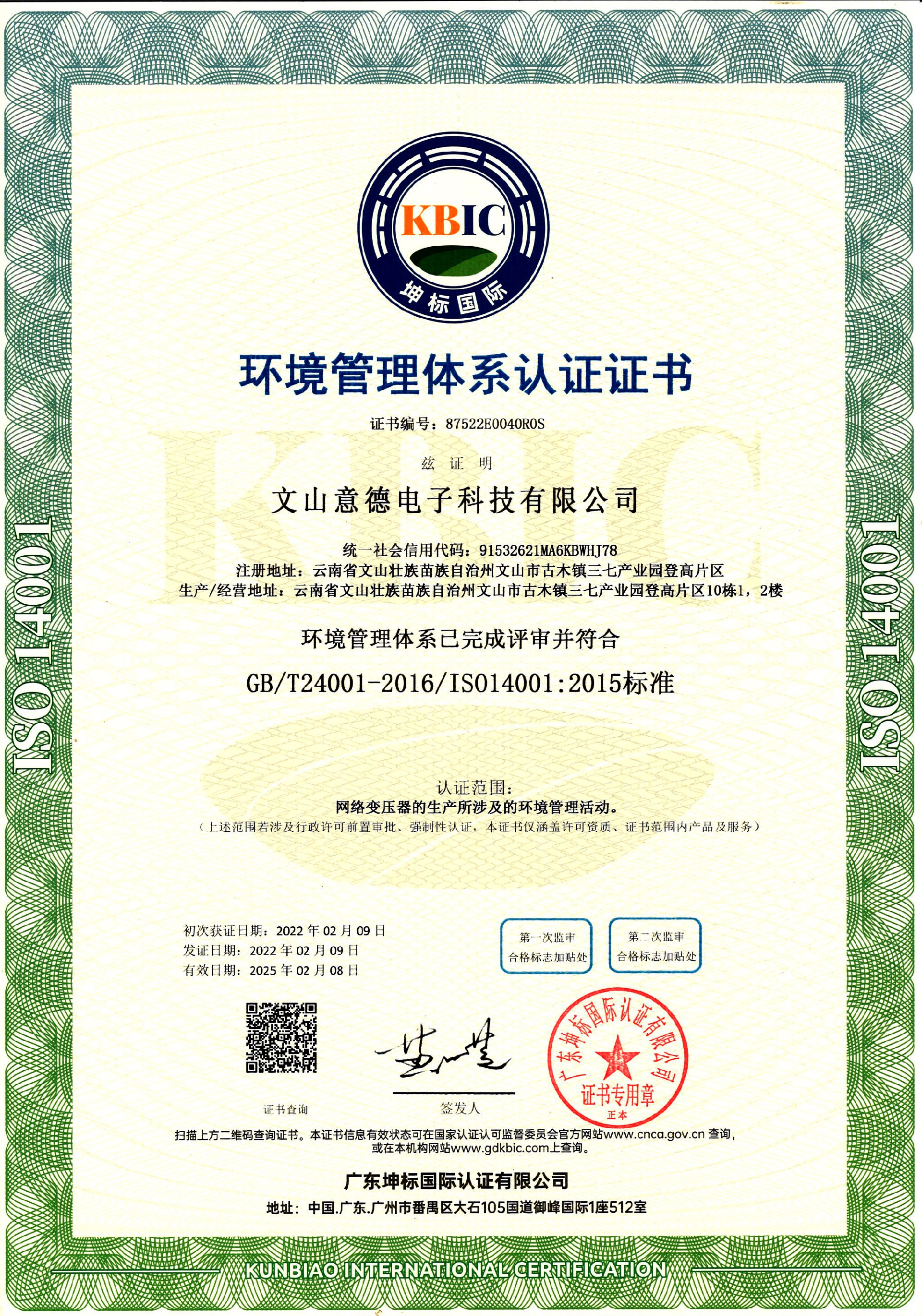 14001環(huán)境管理體系證書-英文版 14001環(huán)境管理體系證書-中文版