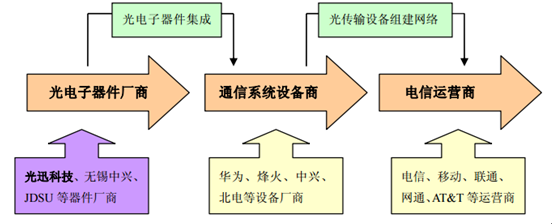 在光纖通信的產業鏈上,光電子器件生產處于產業鏈的上游,光電子器件行業的下游主要是通信系統設備行業,光電子器件產品由通信系統設備廠商系統集成為光傳輸設備,然后再由通信系統設備廠商提供給電信運營商,由電信運營商構建完整的通信網絡后向消費者提供各種電信服務。