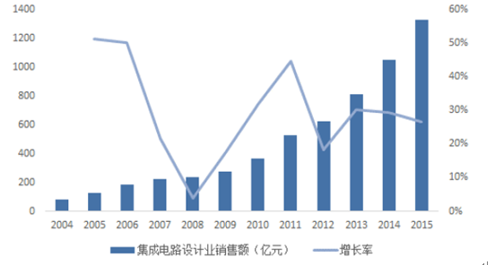 中國積極布局fabless。從銷售額來看,中國芯片設計業持續高速增長,產值由2004年82億元逐年成長至2015年1325億元,2004~2015年復合成長率達29%。