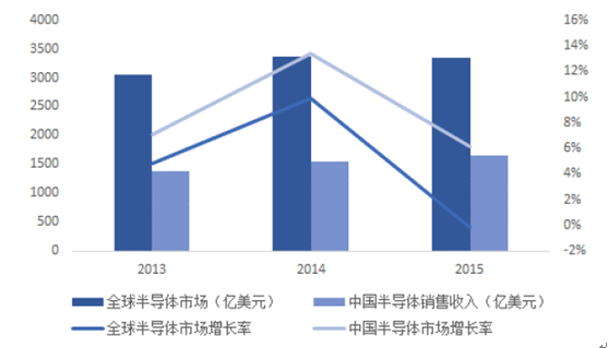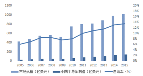 從市場規模和自制能力的角度來看,中國作為全球半導體核心市場,對半導體存在巨大需求,可是根據ICinsights的數據,2015年國內的半導體自給率僅為13.5%左右。