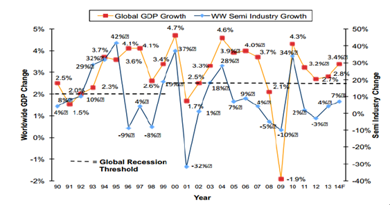 1990~2014年半導體市場增速和全球GDP增速