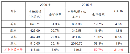 2000年~2015年的16年里,中國半導體市場增速領跑全球,達到21.4%,其中全球半導體年均增速是3.6%,美國將近5%,歐洲和日本都較低,亞太較高13%。就市場份額而言,目前中國半導體市場份額從5%提升到50%,成為全球的核心市場。